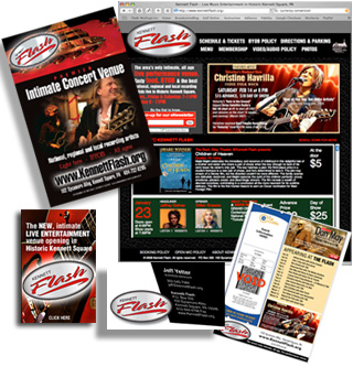 For the Kennett Flash we were given their logo. We created the website first and then their eticket artwork, business cards, postcards and posters to promote the venue to artists and fans and online ads to cross promote on the internet.
