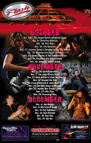 For the Kennett Flash we were given their logo. We created the website first and then their eticket artwork, business cards, postcards and posters to promote the venue to artists and fans and online ads to cross promote on the internet.