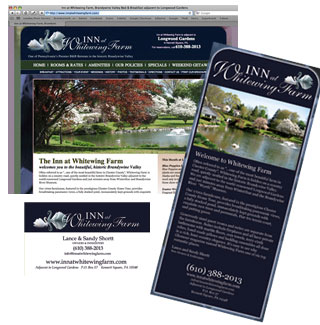 For the Inn at Whitewing Farm we designed their new website first and picked up the colors and swans for their rack cards and business cards. The curves helped tie the look together. The business card is shown uncut. It two has curved edges and is printed on the back with a the full-color trademark photo of their pond.